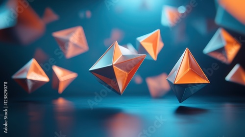 Floating metallic pyramids, blue background, abstract design, tech concept
