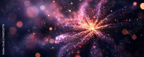 Floating particles creating abstract geometric patterns in a glowing digital space