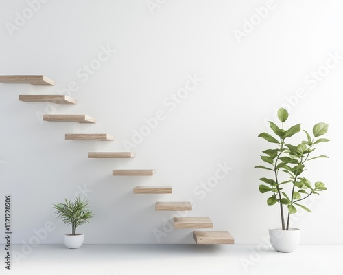 Floating staircase in a minimalist coliving loft, modern and elegant interior design
