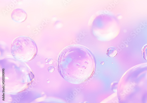 Floating transparent soap bubbles with iridescent reflections. Soft pastel background in pink and blue tones.