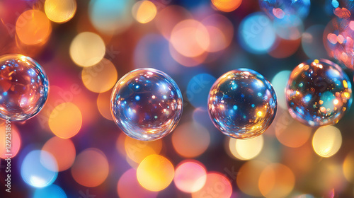 Floating transparent spheres with prismatic reflections. Multiple soap bubbles with iridescent colors and luminous highlights. Banner with 3d glass orbs design background. Holographic irregular balls.