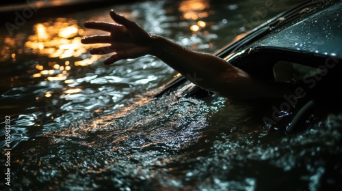 Flood Disaster Nighttime Car Submerged, Hand Reaching, Urgent Help