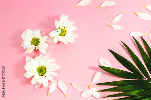 Floral background for design. Chrysanthemum and petals. Space for text.