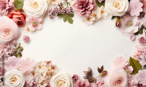 Floral border frame, assorted garden flowers empty space background. Backdrop with copy space