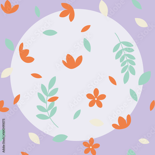 Floral design with pastel colors in a decorative pattern. Abstract flowers and leaves scattered on a lavender background with a light gray circle.