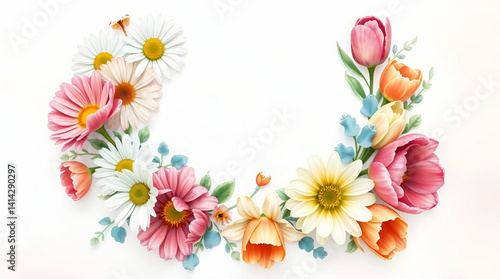 Floral Frame: Colorful Flowers and Leaves Create a Delicate Border on White.