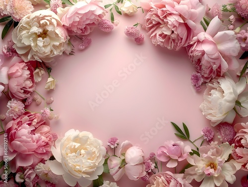 Floral Frame with Pink Roses and Peonies on Soft Background Suitable for Romantic Themes Concept with Copy Space