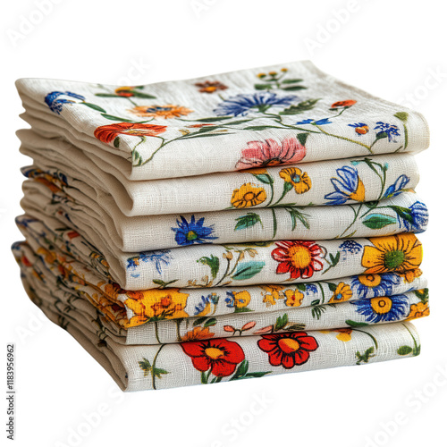 Floral Linen Napkins on White Background, elegantly folded, perfect for table settings, enhancing dining experiences with a touch of charm