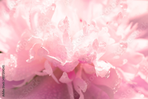 Floral pattern made of close up macro view of many delicate smooth pink colored peony flower. Lots of wet petals with water drops shining on summer sunlight. Design element with copy space.