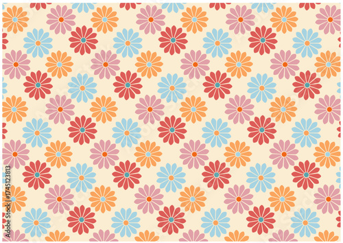 Floral pattern with colorful daisy-like flowers on a light background.
