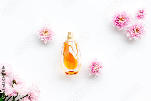 Floral perfume for women. Bottle of perfume near delicate pink flowers on white background top view copy space