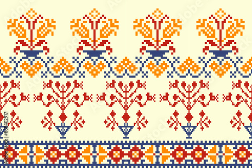 Floral pixel art pattern.Vector seamless pixel art.pixel style,abstract background,cross stitch.design for texture,fabric,cloth,scarf,decoration