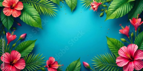 Floral vines weave through palms and hibiscus on a blue background, textile design, blue and white