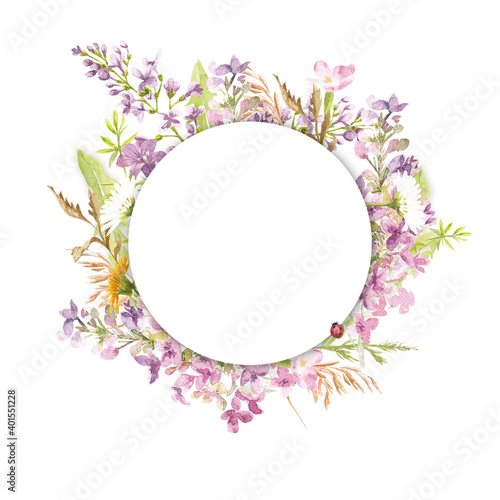 floral watercolor frame. Lilac flowers, dandelions and herbs. Great for the design of Internet posts, pages, for the design of greeting cards, congratulations, invitations.