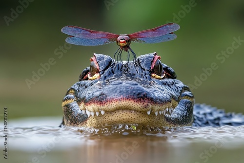 Florida Alligator. Prehistoric Gator with Dragonfly in Aquatic Setting, Myakka River State Park
