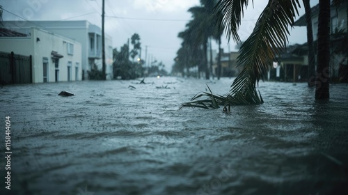 Florida hurricane idea. Flooded street with high water levels during a storm, showcasing environmental challenges.
