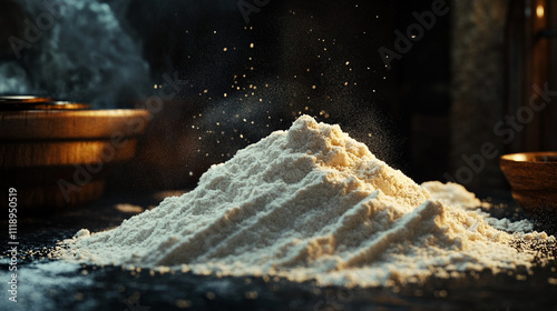 Flour pile with fine texture illuminated in a dimly lit kitchen setting