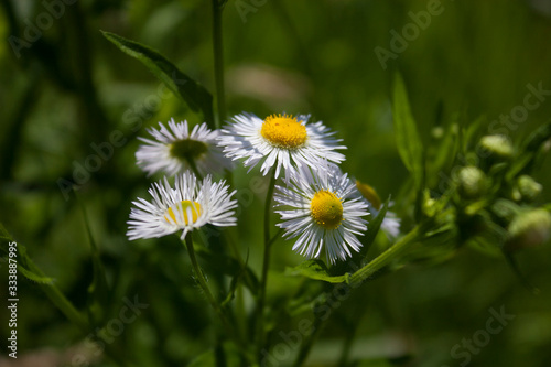 Flower field in the spring time. White flower in the focus with green background. Nature shot with close up flowers.