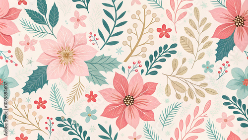 Flower pattern with pink and red poinsettias on light background