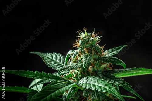 Flowering cannabis plant with white and yellow stigmas and trichomes on a black background with a place for text