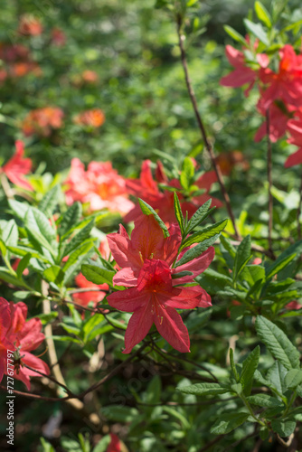 Flowering red color rhododendrons in springtime or summer in botanical garden, vivid color rhododendrons on sunny day outdoors, floral background, close up