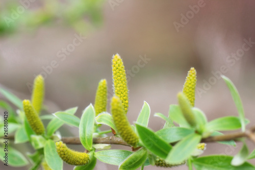 Flowering willow buds bloomed, early spring. Soft focus, close up, macro.