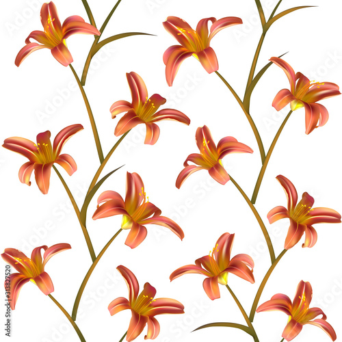 Flowers. Floral background. Lilies. Seamless pattern. White. Orange.