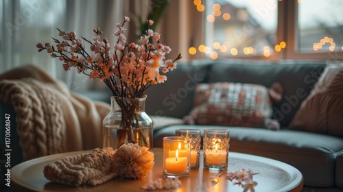 Flowers in a vase and aromatherapy candles in the living room, AI generated image