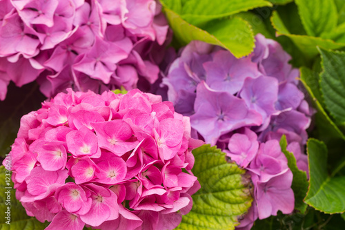 Flowers of a pink and lilac hydrangea