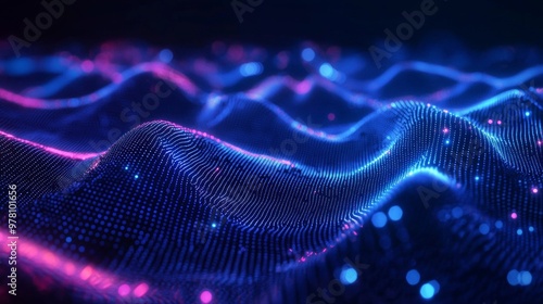 Flowing digital waves of glowing blue and pink dots