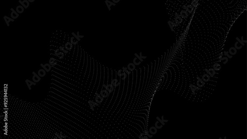Flowing dots particles wave pattern 3D curve halftone gradient curve shape isolated on black background. Vector in the concept of technology, science, music, modern, cover, poster, flyer, card, web.