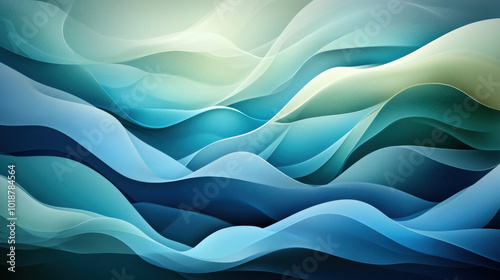 Flowing forms create abstract underwater world with shades of blue and green, evoking sense of tranquility and depth. smooth curves and gradients enhance serene atmosphere