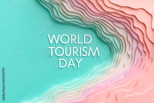 Flowing layers of pastel colors create an abstract backdrop, highlighting "World Tourism Day" in a creative and visually appealing design.