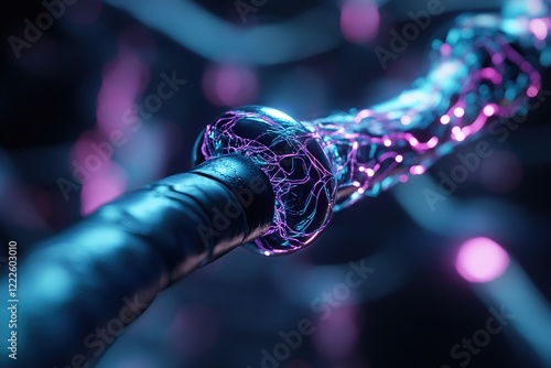 Flowing lines and vein-like structures create a glowing network in shades of blue and purple, set against a dark background with highlights