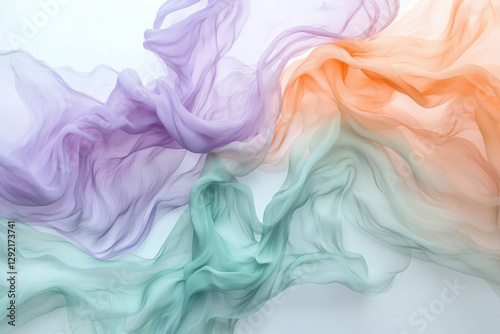 Flowing pastel chiffon fabric in shades of purple, orange, and teal, creating a dreamy abstract image.