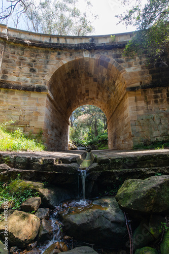 Flowing water under Lennox Bridge, the oldest arch bridge in Australia.