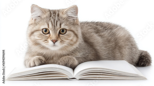 Fluffy cat rests on open book, showcasing its curious expression and soft fur. scene evokes sense of calm and companionship