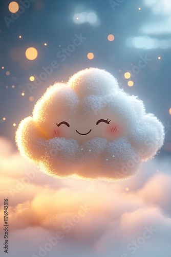 Fluffy cloud character smiling amidst soft glowing lights and dr