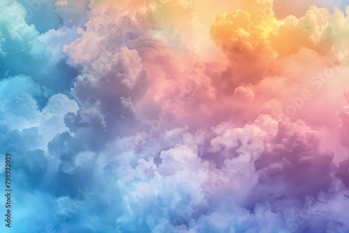 Fluffy clouds in a rainbow spectrum of colors, featuring soft gradients and dreamy shapes. Rainbow cloud textures offer a whimsical and magical backdrop