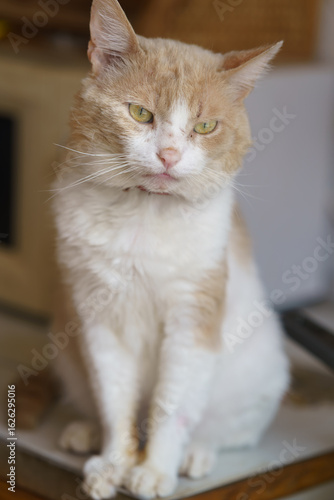 Fluffy ginger cat sitting gracefully on a table in a cozy indoor setting during daylight hours