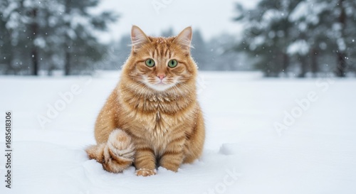 Fluffy ginger cat sitting in snow looking at camera with winter scenery