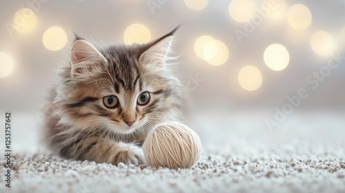 Fluffy kitten playing with a ball of yarn on cozy background with soft bokeh lights enhancing the playful atmosphere