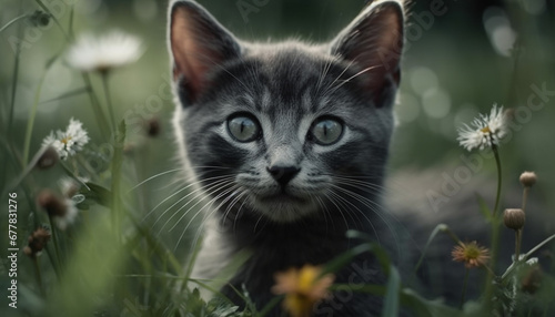 Fluffy kitten staring at daisy, beauty in nature portrait generated by AI