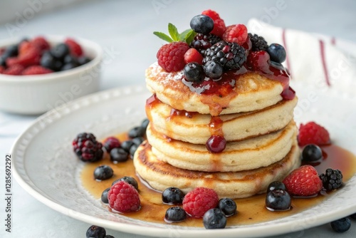 Fluffy pancakes stacked high with juicy berries and a drizzle of sweet syrup, white background, tablecloth, syrup, breakfast, stack