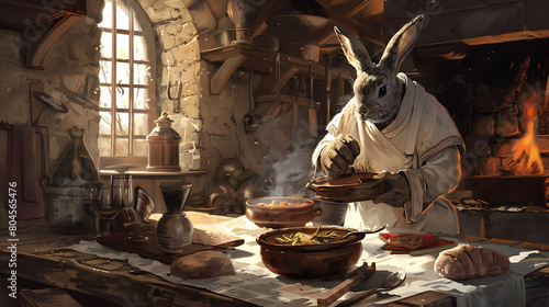 Fluffy Rabbit Cooking a Medieval Culinary Masterpiece in a Cozy Rustic Kitchen