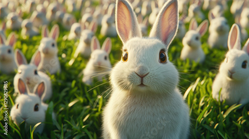 Fluffy rabbit in lush green field, surrounded by many others, creating lively and cheerful atmosphere. scene captures essence of nature and playfulness