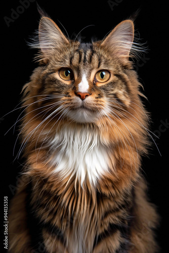 Fluffy tortoiseshell Maine Coon cat on a black background
