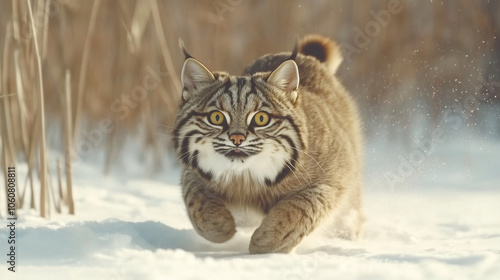 Fluffy wildcat trekking through a barren, snowy expanse, following faint prey trails in a raw, frigid landscape, embodying survival instincts in nature’s frozen terrain