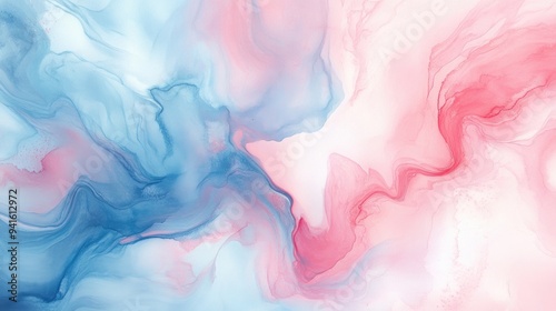 Fluid abstract watercolor illustration with soft pink and blue marbled swirls, capturing a peaceful and serene ambiance