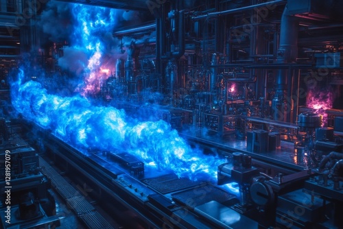 Fluid dynamics create stunning blue glow in futuristic industrial facility during nighttime operations